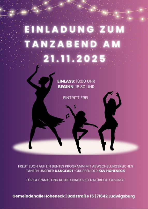 Die Turnabteilung der KSV Hoheneck lädt am Freitag, 21. November 2025 zum gemütlichen Tanzabend in die Gemeindehalle Hoheneck ein.