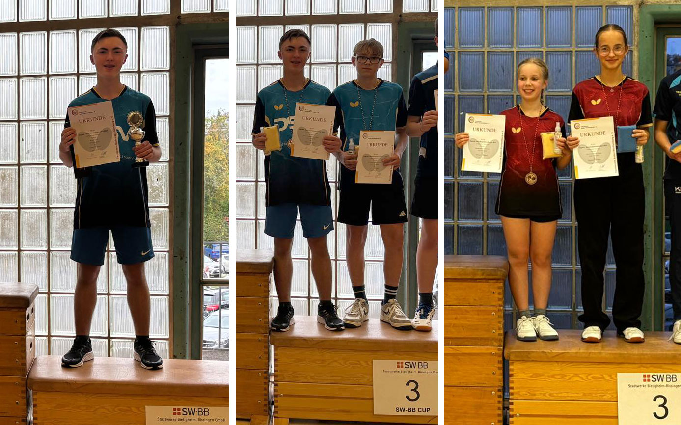 Johanna Braun erreichte bei den Mädchen 12 einen hervorragenden 3. Platz im Einzel. Ihre Schwester Katharina, die erstmals überhaupt an einem Tischtennisturnier teilnahm, überraschte bei den Mädchen 10 mit einem tollen 4. Platz – und durfte sich gleich über ihren ersten Pokal freuen.