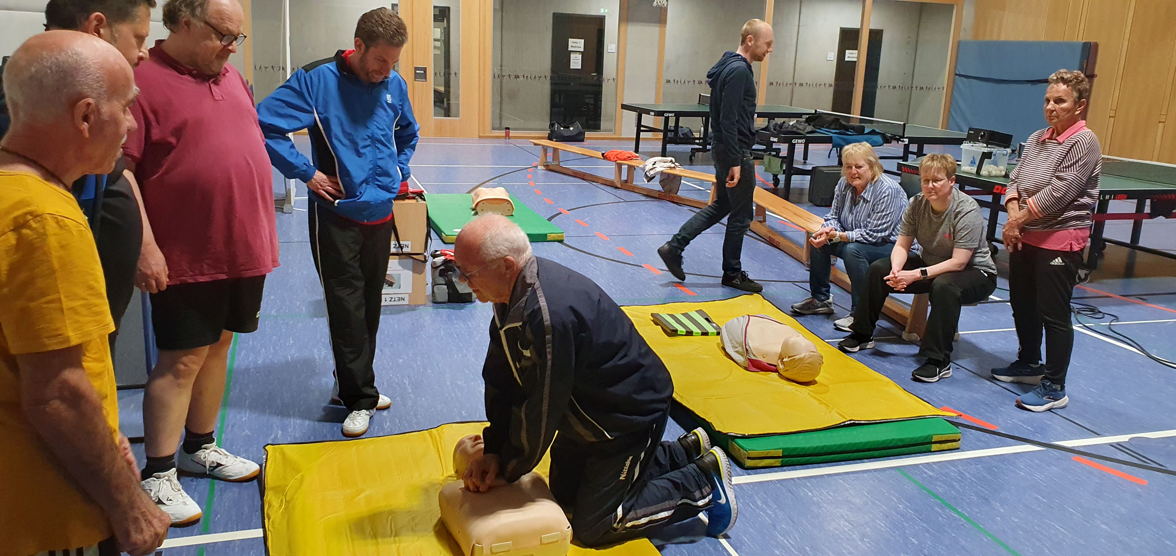 Herzsicher-Schulung der Tischtennisabteilung in der Hohenecker Grundschul-Sporthalle bringt die Teilnehmenden in schwitzen.